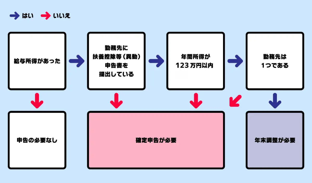 源泉徴収は概算で算出された所得税であり、多めに徴収されている場合があります。全員が還付の対象になるわけではありませんが、以下のフローチャートで自分がどれに該当するのかを判断してみましょう。
